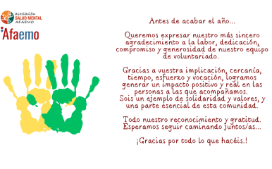 Con motivo de estas fechas tan especiales, queremos haceros llegar nuestros mejores deseos. Que el nuevo año venga cargado de salud, ilusión y nuevos proyectos compartidos. Juntos y juntas seguiremos haciendo camino en pro de la salud mental, y seguiremos haciendo posible el crecimiento y la continuidad de nuestra asociación. Felices fiestas y próspero Año […]
