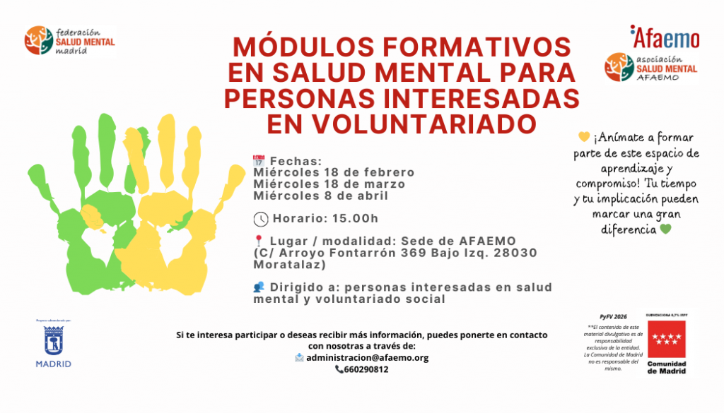 Desde nuestro proyecto de «Promoción y Formación de Voluntariado en Salud Mental» queremos informar y difundir las formaciones en salud mental que realizaremos este año dirigidas a todas aquellas personas que estén interesadas en realizar voluntariado y colaborar activamente con nuestra entidad.