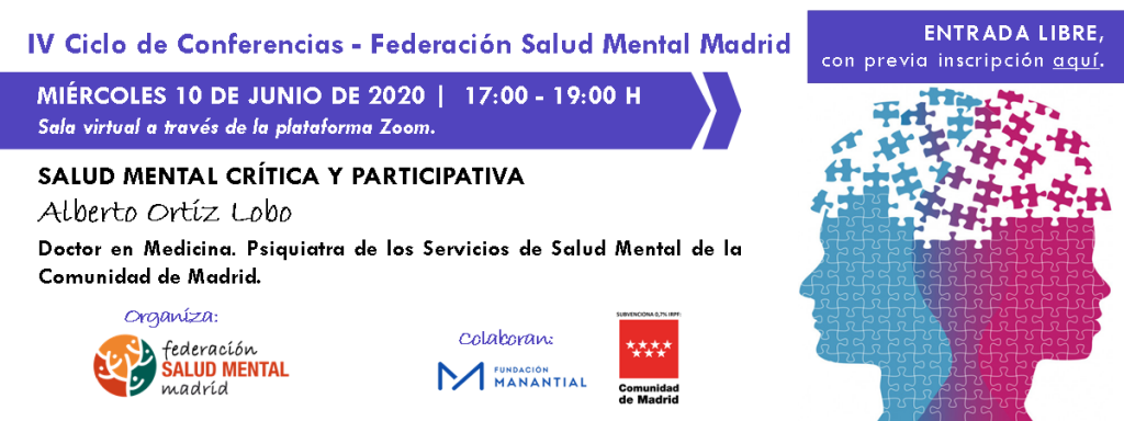 El próximo miércoles 10 de junio de 2020 a las 17:00 horas, a través de la plataforma Zoom, se llevará a cabo la conferencia «Salud Mental crítica y participativa«, a cargo de Alberto Ortiz Lobo, Doctor en Medicina y Psiquiatra de los Servicios de Salud Mental de la Comunidad de Madrid.