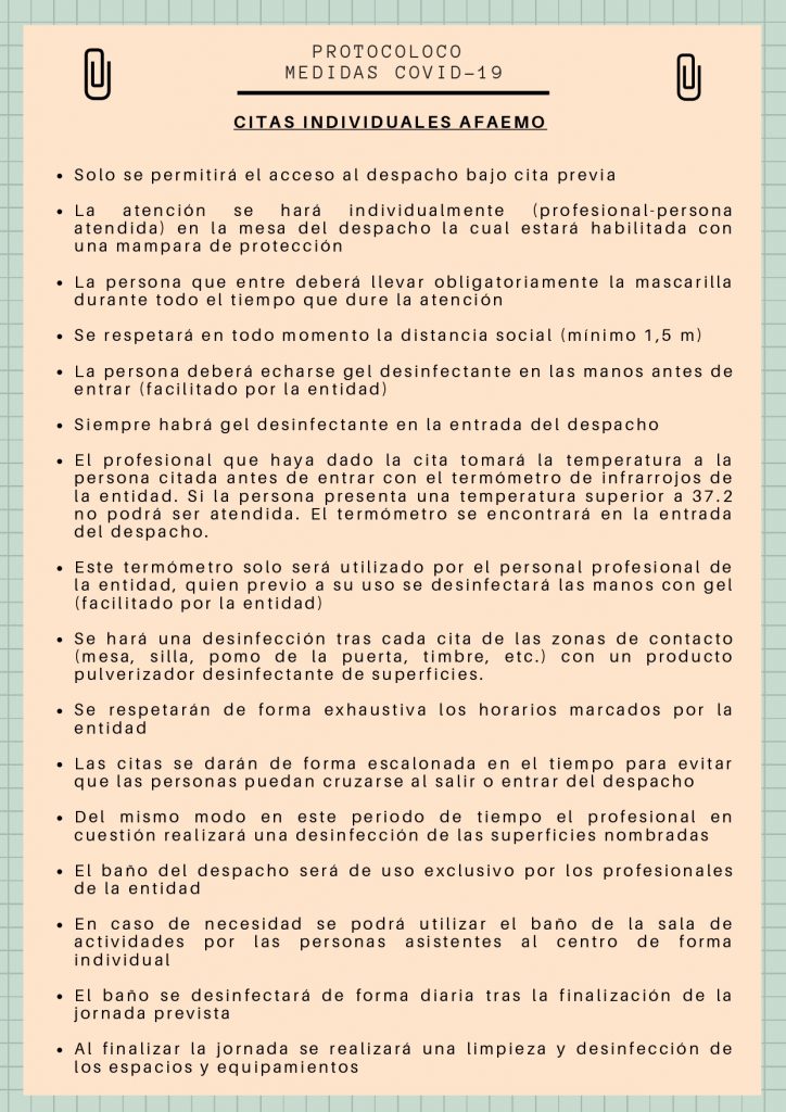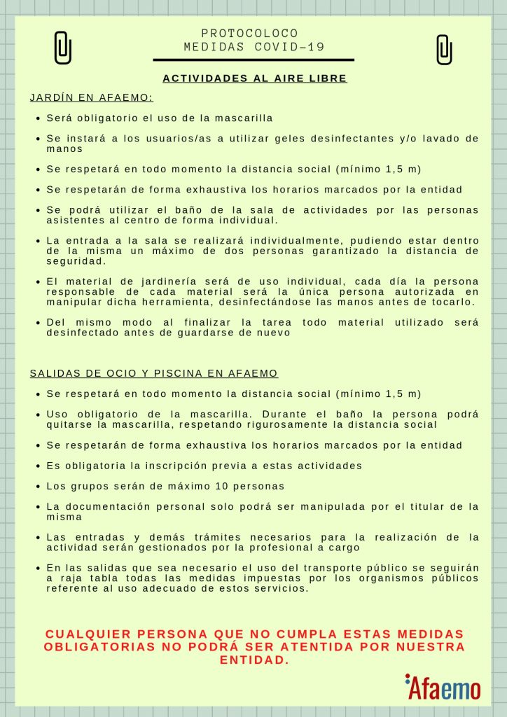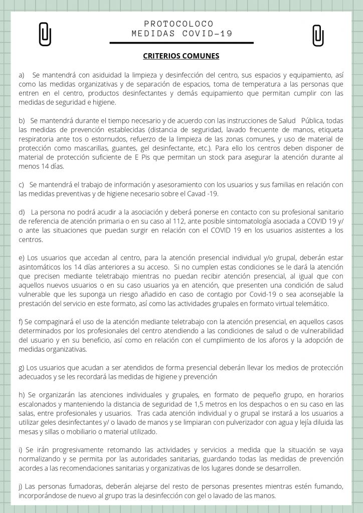 Seguiremos trabajando como siempre para todo lo que necesitéis y esté en nuestra mano. Por ello se ha decidido, por lo menos durante el mes de septiembre, seguir con el protocolo de actuación que llevamos a cabo durante el mes de julio. Se fomentarán las actividades al aire libre y las atenciones individuales con cita previa (teniendo presente como siempre las necesidades de acompañamientos individuales que puedan surgir) combinando las mismas con actividades virtuales. Todo ello se podrá ver en el calendario mensual que prepararán las trabajadoras como cada mes, el cual estará disponible seguramente a lo largo de mañana. A finales de septiembre se volverá a reunir la junta directiva de la asociación, para volver a valorar la situación y tomar decisiones nuevas. Confiando que la situación mejore y podamos ir cada vez retomando más actividades presenciales en beneficio y garantizando la salud de todas las personas.