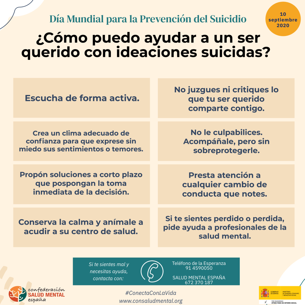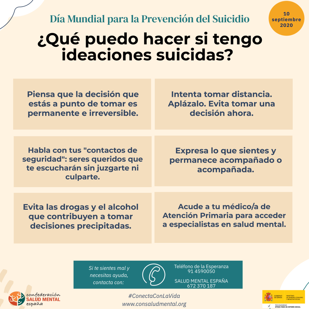 Tomar distancia y aplazar la decisión, plantear soluciones que permitan ese aplazamiento, contar con una red de contactos de seguridad, escuchar sin juzgar ni criticar, o acudir a profesionales de la salud, son algunas de las recomendaciones que se recogen en estos materiales, en los que también se apela a la necesidad de contar con un Plan Nacional de Prevención del Suicidio, que vertebre todas las acciones encaminadas a prevenir esta causa de muerte.