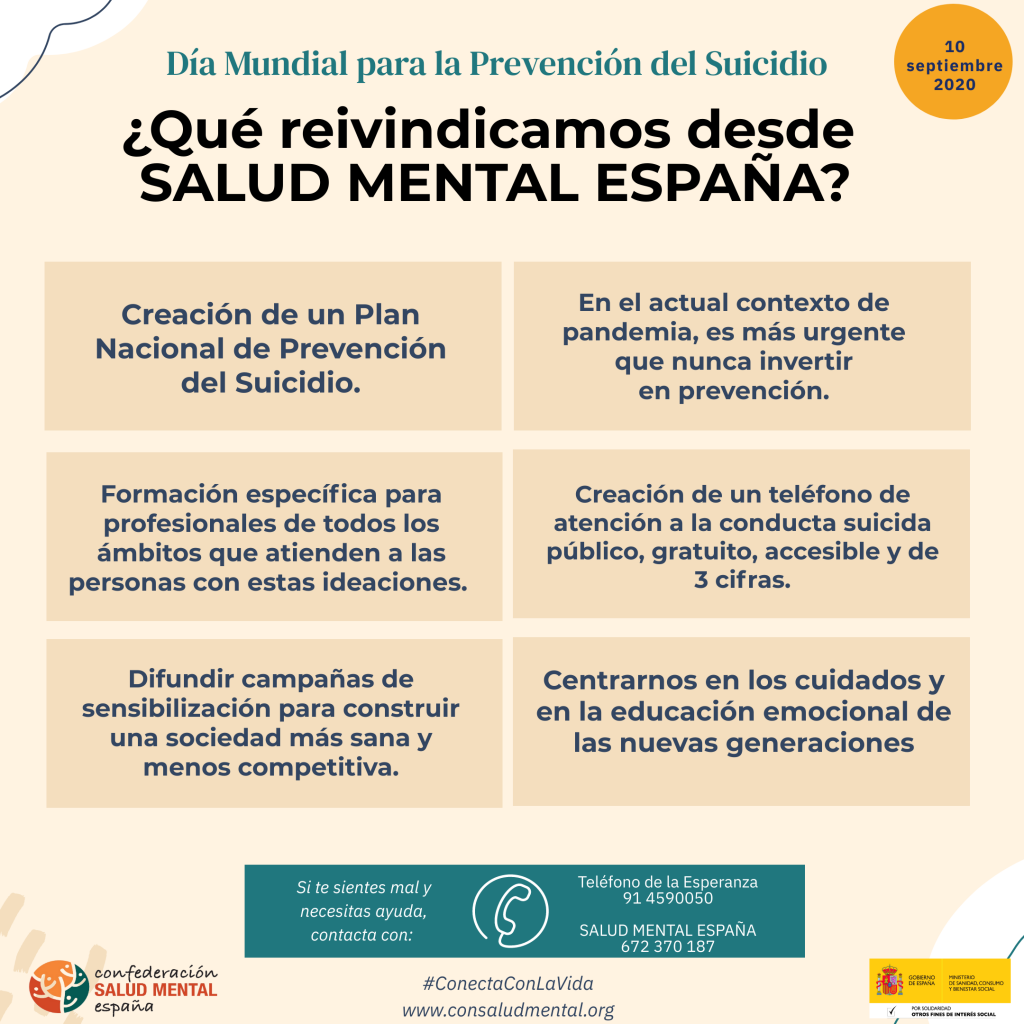 El Plan, cuyo objetivo sería disminuir la tasa de suicidios y prevenir las conductas suicidas, debería contemplar la implantación de un servicio telefónico de atención al riesgo suicida, de carácter público y gratuito, evitando así iniciativas que carecen de control o atención profesional. Además, debería servir para sensibilizar y mejorar la información a la población general a través de campañas de concienciación promovidas por instituciones públicas, medios de comunicación y entidades sociales dedicadas a la causa y ayudar a detectar precozmente el riesgo suicida.