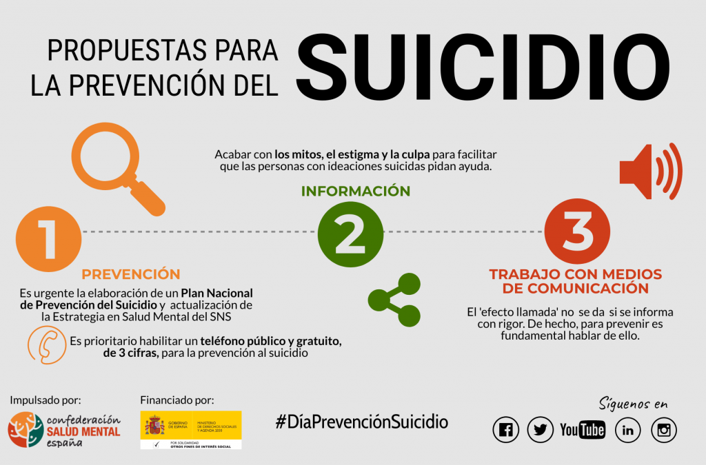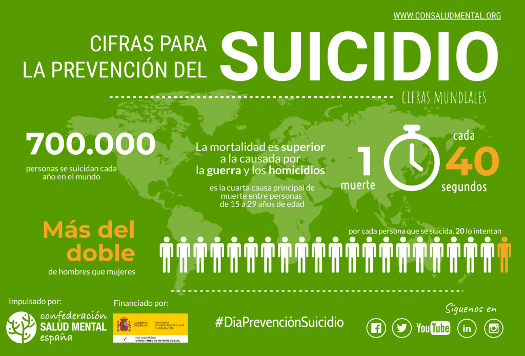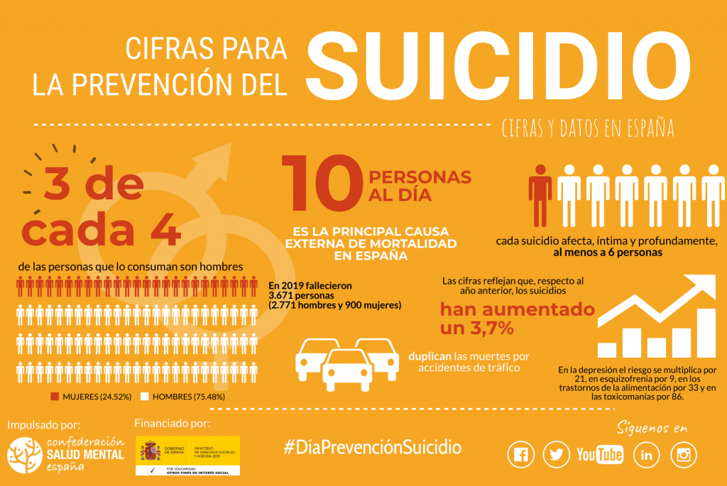 En España, 3.671 personas fallecieron en 2019 por esta causa, de las cuales 2.771 eran hombres y 900 eran mujeres. Esto supone un crecimiento del 3,7% respecto al año anterior. Ante esta realidad, SALUD MENTAL ESPAÑA reitera la necesidad de poner en marcha un Plan Nacional de Prevención del Suicidio para abordar de forma transversal esta compleja problemática, así como la puesta en marcha de un teléfono público, gratuito y accesible de tres cifras para atender a las personas con conducta suicida y a su entorno.