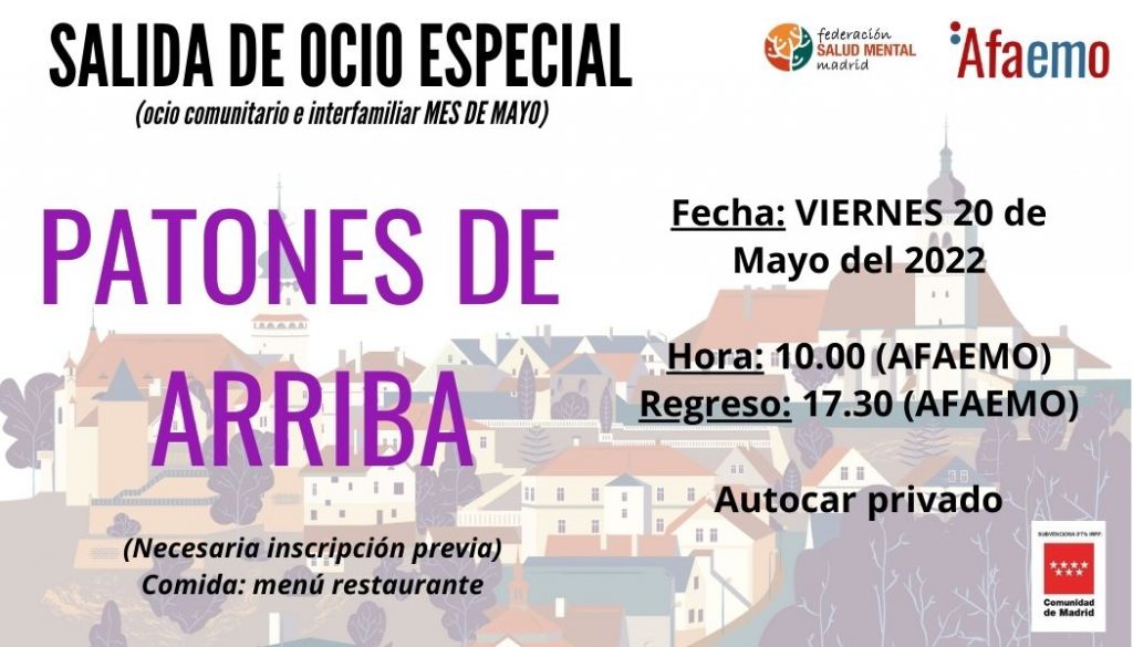 Tenemos el placer de anunciar nuestra próxima… ¡¡¡SALIDA DE OCIO ESPECIAL, INTERFAMILIAR Y COMUNITARIO!!! en este mes de mayo con un destino de los más maravilloso… ¡PATONES DE ARRIBA! un pequeño municipio situado en el nordeste de Madrid, donde por un sendero entre olivares llegamos hasta este pueblo medieval, famoso por sus casas de pizarra negra y sus calles sinuosas. Lo que le hace uno de los enclaves rurales más bonitos de España.