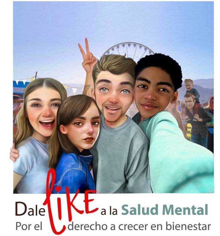 La imagen, elaborada por el diseñador Antonio Lorente, pretende conectar con la población más joven, poniéndoles en primer plano y haciendo un guiño a una de las vías de comunicación que más utilizan jóvenes y adolescentes: las redes sociales. En ella, se ilustra una publicación, que lleva por título el lema ‘Dale like a la salud mental. Por el derecho a crecer en bienestar’, en la que aparece grupo de adolescentes sacándose un selfie en un entorno lúdico, pero con diferentes expresiones en sus rostros. Esta escena introduce, además, una de las temáticas clave: los altos niveles de uso de las redes sociales y su correlación con la aparición de depresión, ansiedad, estrés, adicción a internet, etc. Al fondo, se distinguen más personas, entre ellas un hombre sosteniendo a un niño pequeño. La idea es posicionar a niñas, niños, adolescentes y jóvenes como protagonistas del Día Mundial de la Salud Mental.