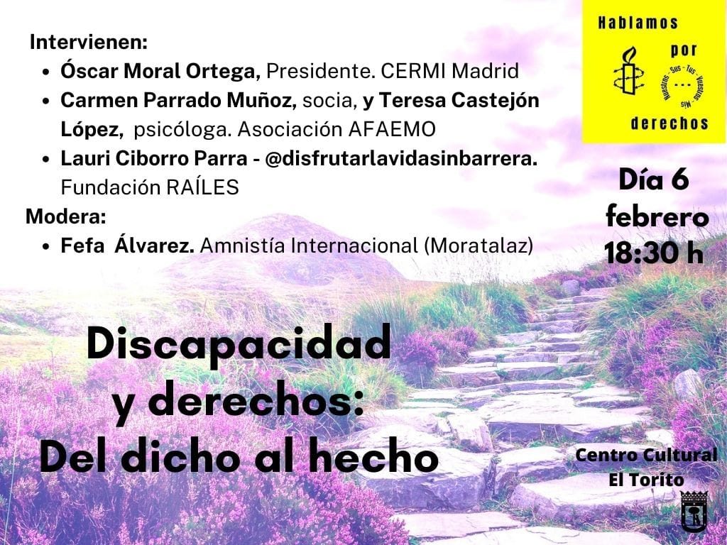 El lunes que viene, día 6 de febrero 2023, estaremos colaborando en una mesa redonda organizada por Amnistía Internacional Moratalaz en la que hablaremos de las brechas e impedimentos con las que nos encontramos en atención a la discapacidad. «DISCAPACIDAD Y DERECHOS: DEL DICHO AL HECHO»