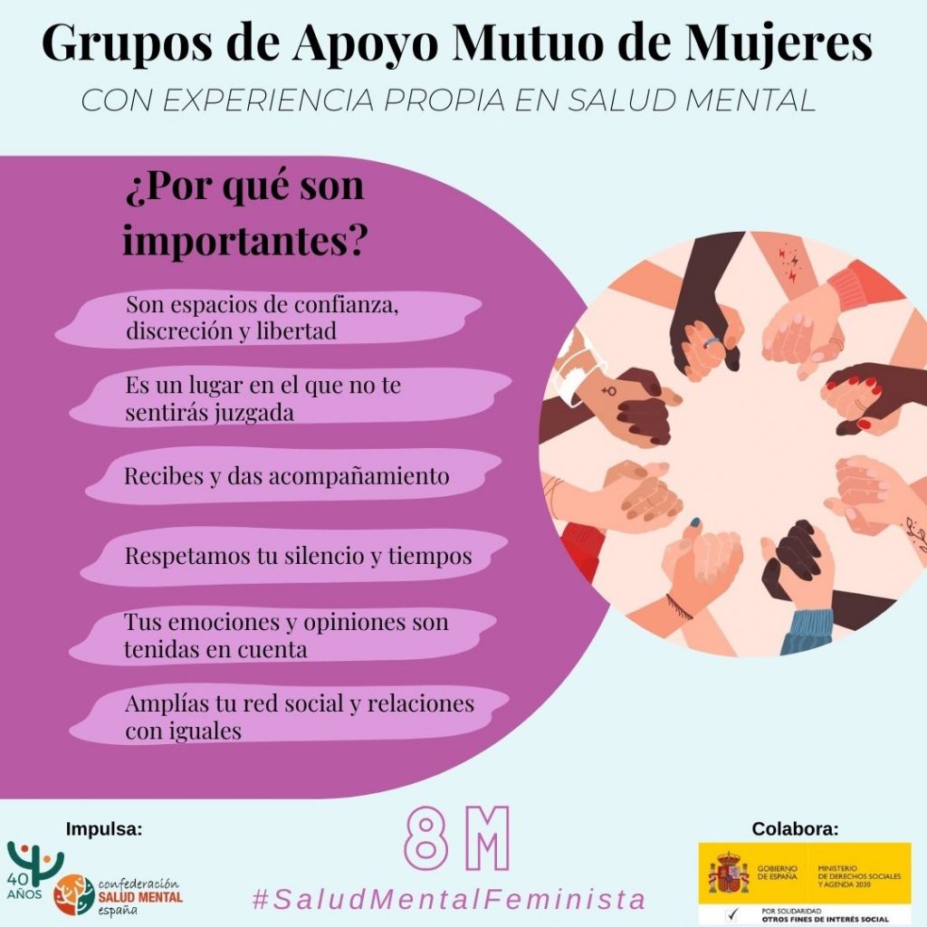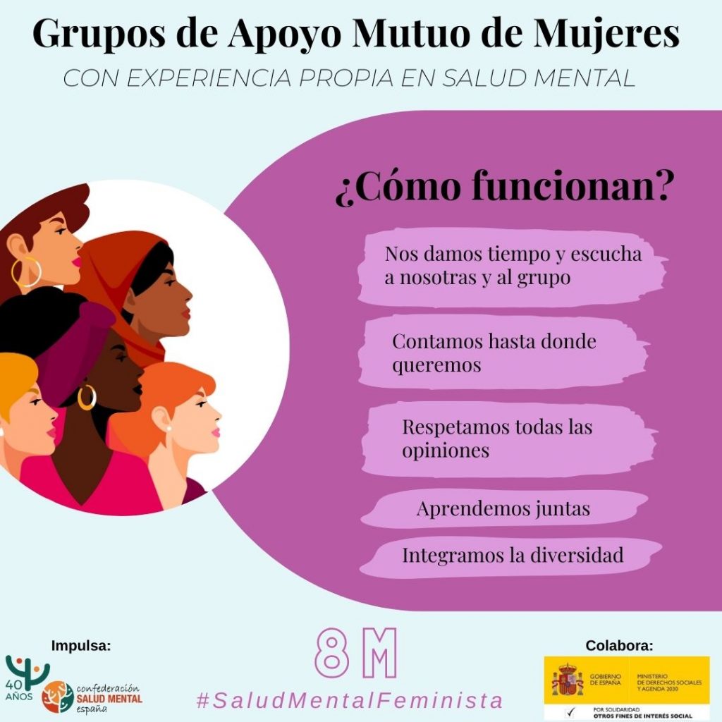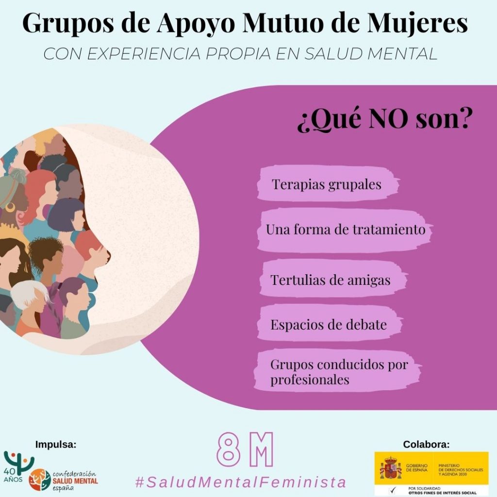 Los grupos de apoyo mutuo de mujeres con experiencia propia en salud mental son espacios en los que se comparten experiencias, lugares seguros para las asistentes, libres de violencia machista, que se basan en la horizontalidad y en la igualdad. Se trata de reuniones periódicas en las que las mujeres con problemas de salud mental se dan apoyo y comparten un mismo problema, o similar, para intentar superarlo.