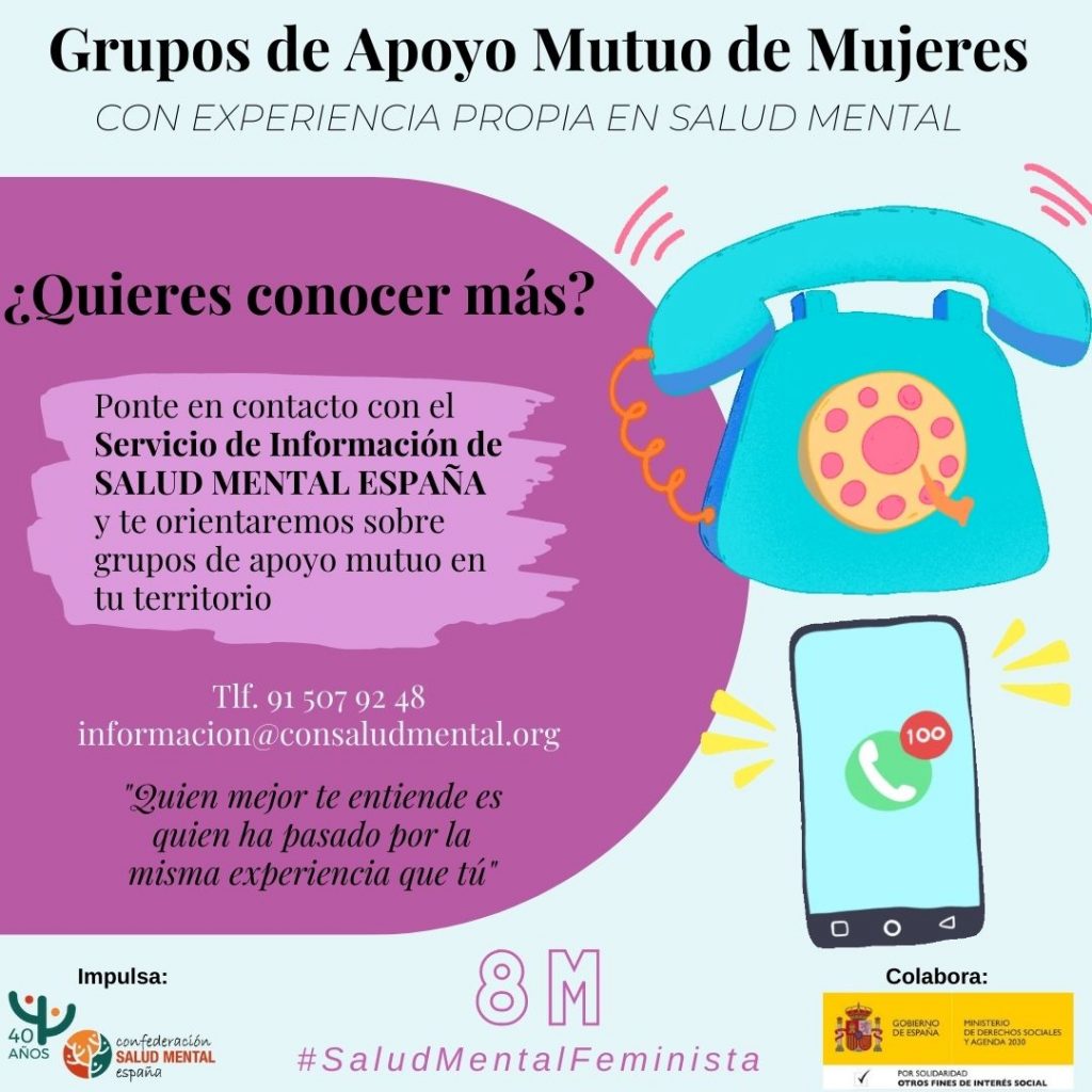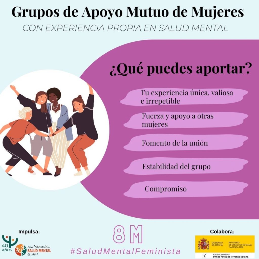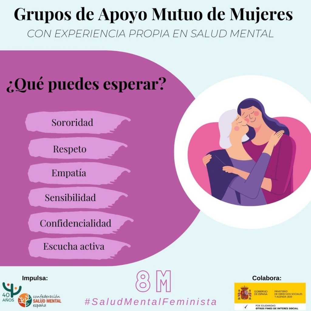 Los grupos de apoyo mutuo de mujeres con experiencia propia en salud mental son espacios en los que se comparten experiencias, lugares seguros para las asistentes, libres de violencia machista, que se basan en la horizontalidad y en la igualdad. Se trata de reuniones periódicas en las que las mujeres con problemas de salud mental se dan apoyo y comparten un mismo problema, o similar, para intentar superarlo.