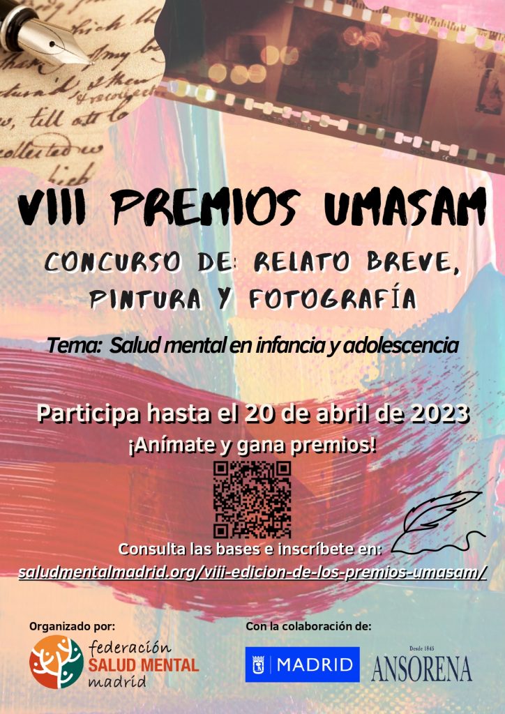 - Hasta el 20 de abril de 2023 puedes presentar tus obras a los VIII Premios UMASAM de la Federación Salud Mental Madrid.