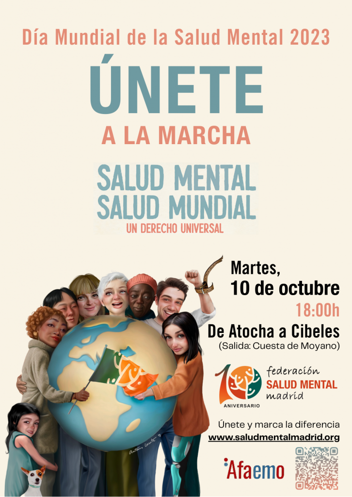 La Federación Salud Mental Madrid y las 16 asociaciones que la conforman, nuevamente saldrán a la calle, convocando una marcha para el martes 10 de octubre a las 18:00 horas con motivo del Día Mundial de la Salud Mental 2023, bajo el lema que ha sido elegido por votación popular “Salud mental, salud mundial. Un derecho universal”, tomando como punto de partida la temática propuesta por la Federación Mundial para la Salud Mental que centra el foco en la salud mental como un derecho humano universal.