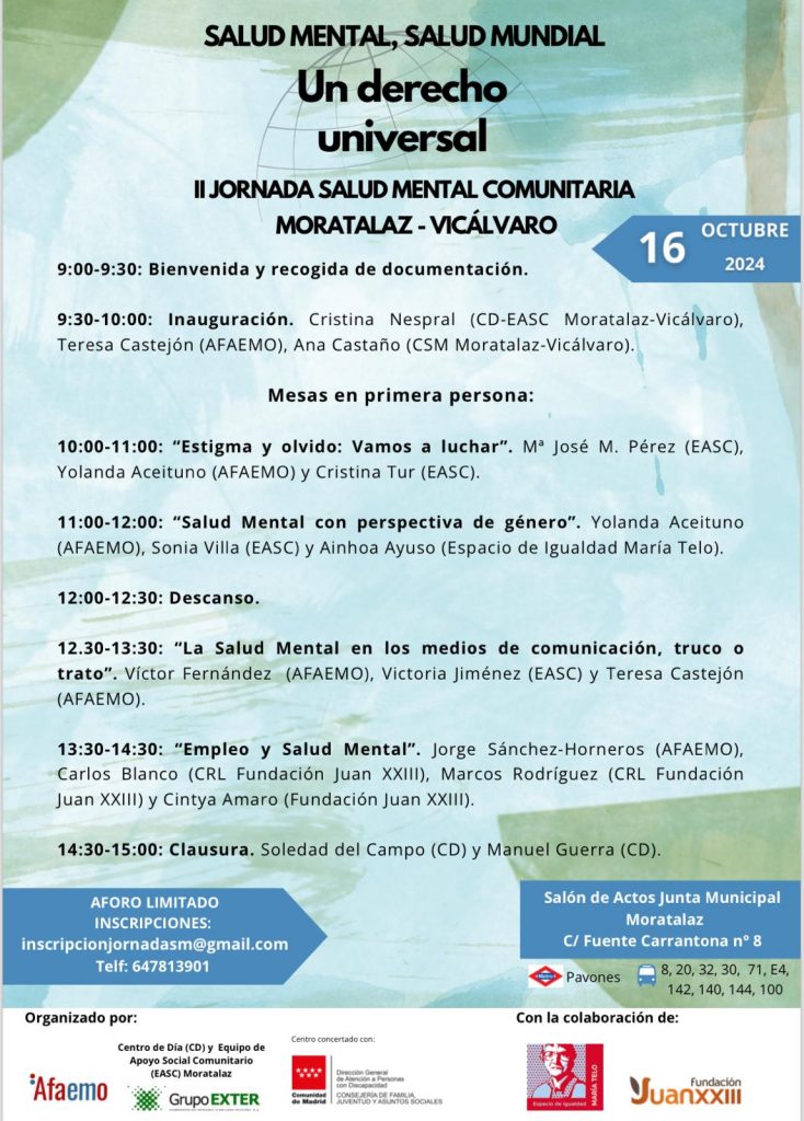 - Con motivo del Día Mundial de la Salud Mental desde la Asociación AFAEMO y el Centro de Día y Equipo de Apoyo Social Comunitario Moratalaz – Vicálvaro se va a realizar la II Jornada Salud Mental Comunitaria el día 16 de octubre de 2024.