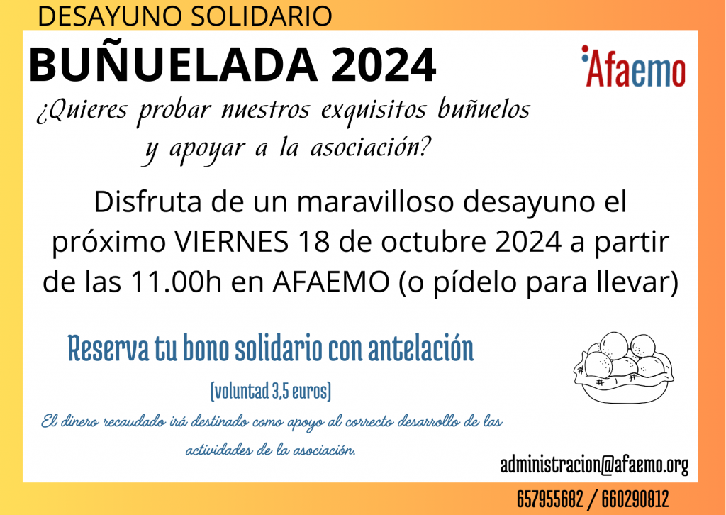 Este se preparará el próximo viernes 18 de octubre en la sala de la asociación a partir de las 11.00h (también estará disponible la opción de pedirlo para llevar). Consistirá en compartir un desayuno juntos/as durante esa mañana pudiendo degustar unos exquisitos buñuelos caseros (preparados por las propias personas de la asociación) junto a un chocolate caliente o café.
