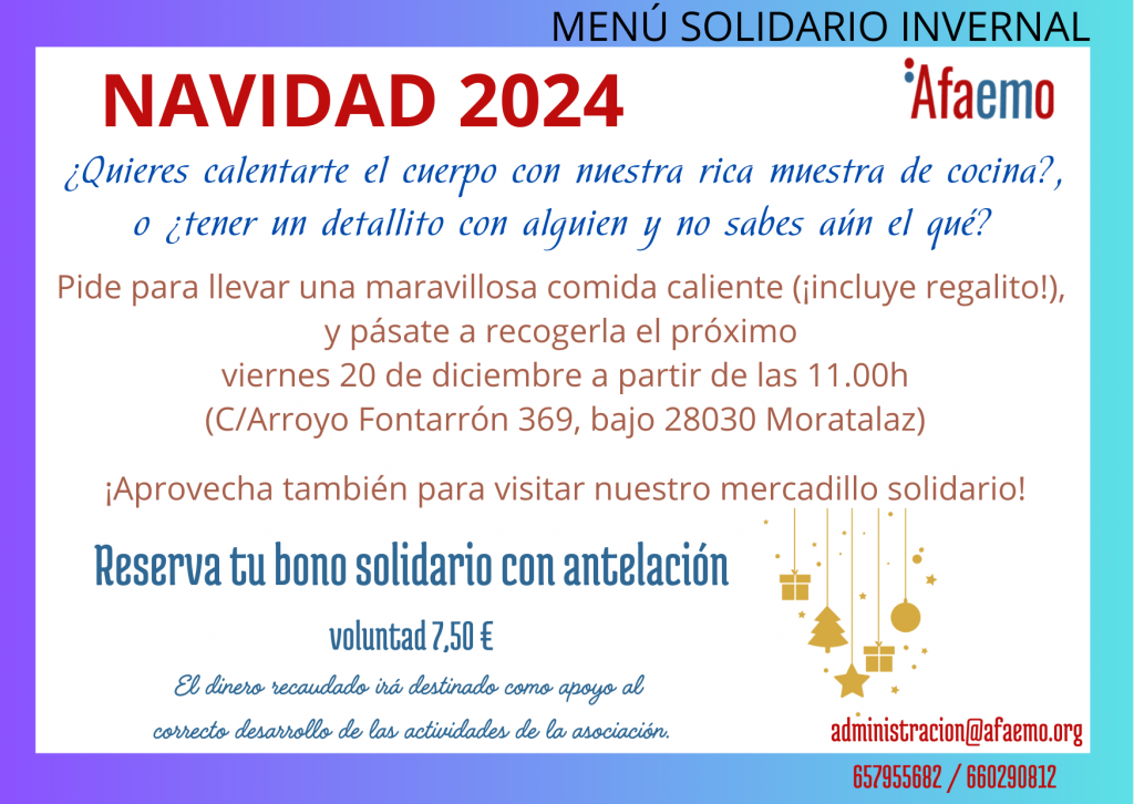 Puedes reservar tu bono para el menú solidario «muestra de cocina invernal» a través del correo electrónico administracion@afaemo.org, llamando a los teléfonos 913713529 / 657955682 / 660290812 o yendo presencialmente a la asociación.