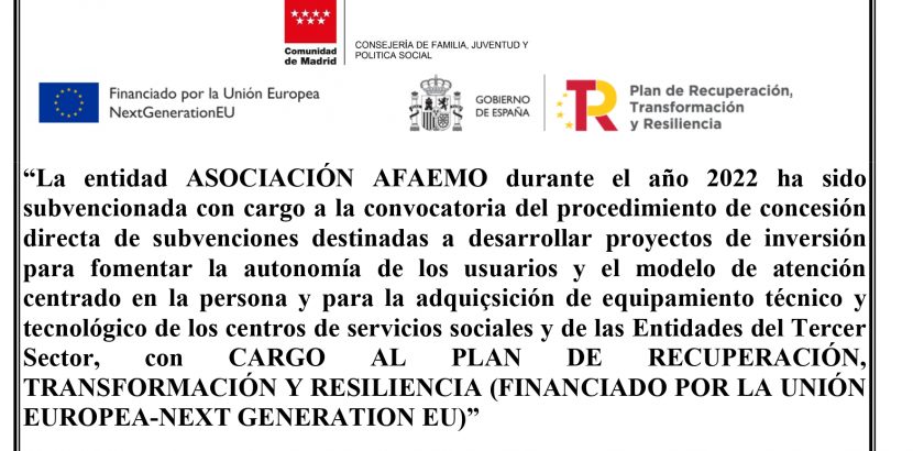 La entidad ASOCIACIÓN AFAEMO durante el año 2022 ha sido subvencionada con cargo a la convocatoria del procedimiento de concesión directa de subvenciones destinadas a desarrollar proyectos de inversión para fomentar la autonomía de los usuarios y el modelo de atención centrado en la persona y para la adquisición de equipamiento técnico y tecnológico de […]
