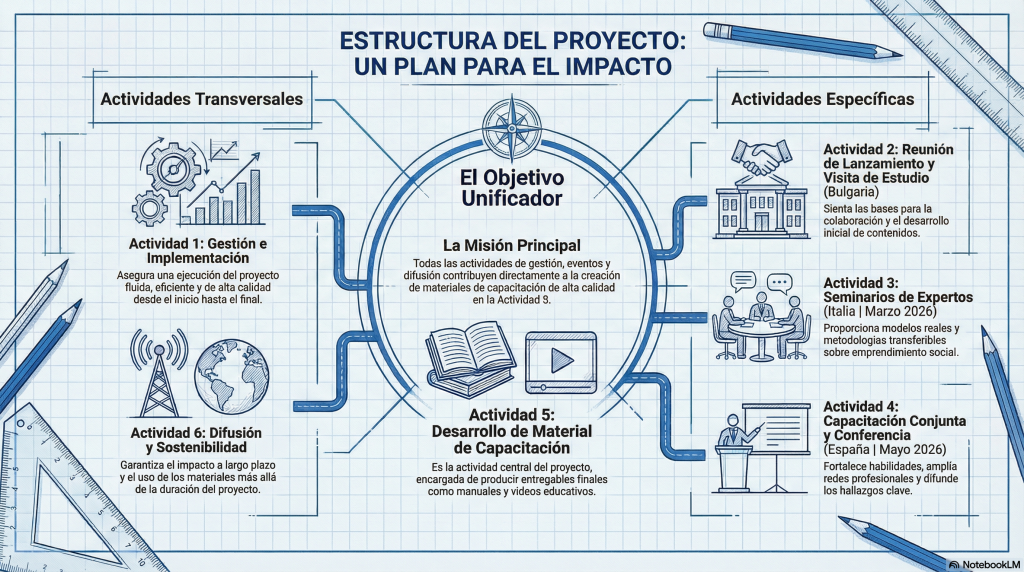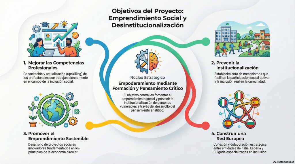 Esta sección forma parte de un proyecto europeo Erasmus+ (KA210 – Educación de Personas Adultas) en el que participamos junto a entidades de Italia y Bulgaria, centrado en la formación, el aprendizaje compartido y el desarrollo de prácticas innovadoras en los ámbitos de la desinstitucionalización y el emprendimiento social.